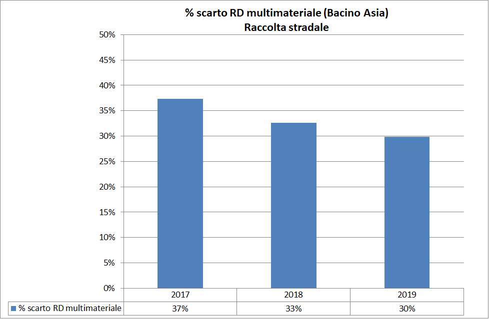 Nel 2019 il valore percentuale di scarto presente nel multi-materiale conferito dagli utenti è sceso al 30%, grazie alla costante attività di educazione ambientale e all’introduzione (da luglio 2018) della riorganizzazione delle raccolte stradali mediante le nuove isole denominate “Ritorno al futuro”.