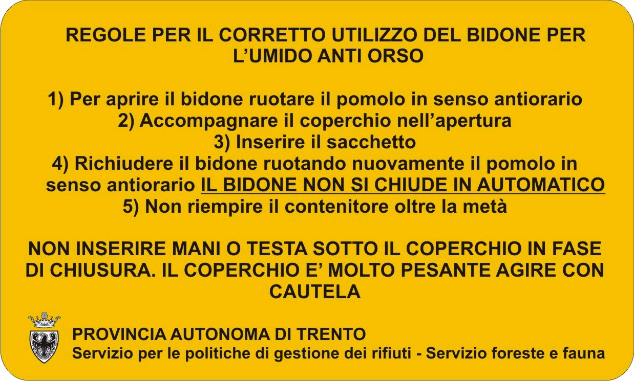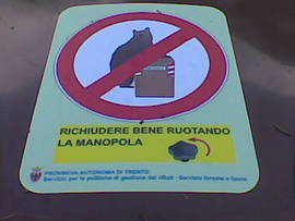 Dopo una serie di "visite" ai contenitori stradali della frazione organica in diversi Comuni del Trentino, ed in particolare nella zona dell'Altopiano della Paganella, la Provincia Autonoma di Trento attraverso il Servizio Foreste e Fauna ed il Servizio Politiche di Gestione dei Rifiuti ha predisposto un progetto per impedire che l'orso possa essere attratto dai rifiuti di mense e cucine.