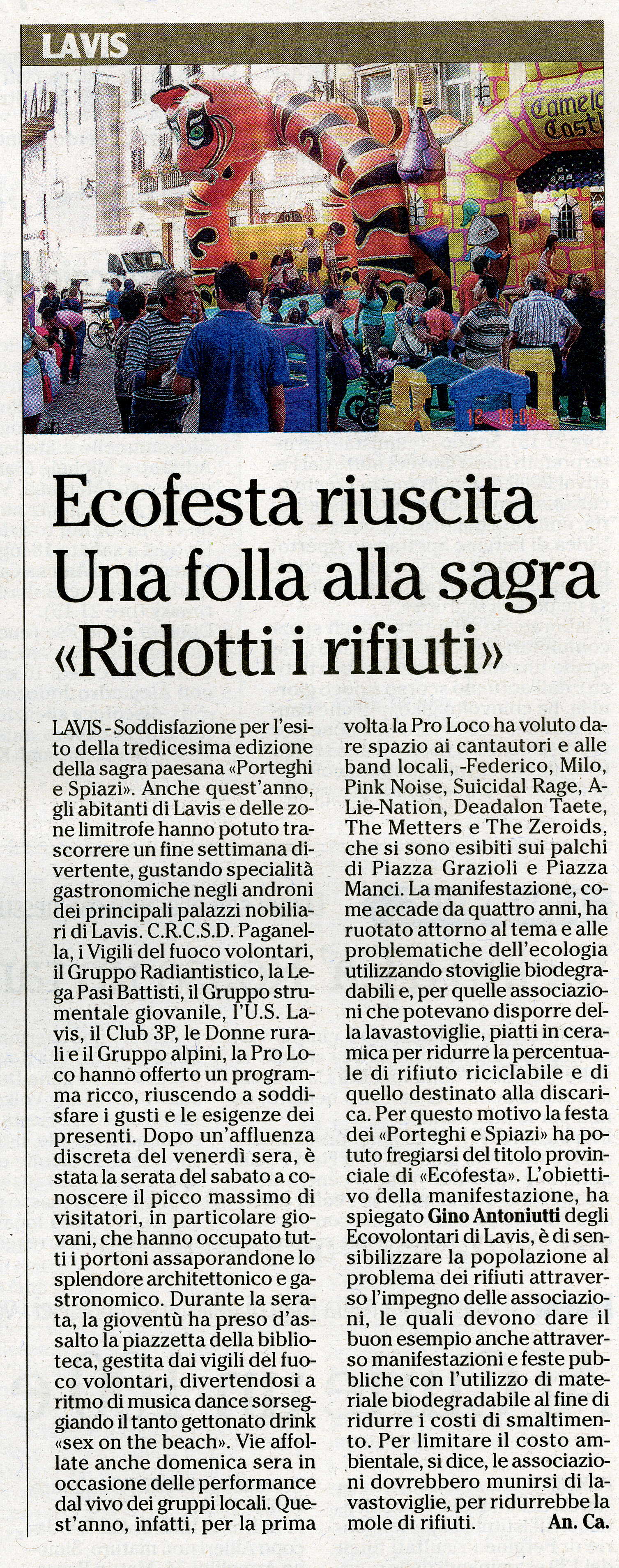 La Prima Ecofesta del Trentino è stata la Festa dei Porteghi e Spiazi, svoltasi nei giorni 10, 11 e 12 luglio 2009: grazie all'impiego di stoviglie in ceramica o biodegradabili, si è eliminato quanto più possibile l'utilizzo di materiale plastico e si è effettuata una raccolta differenziata più ampia possibile dei vari materiali utilizzati.